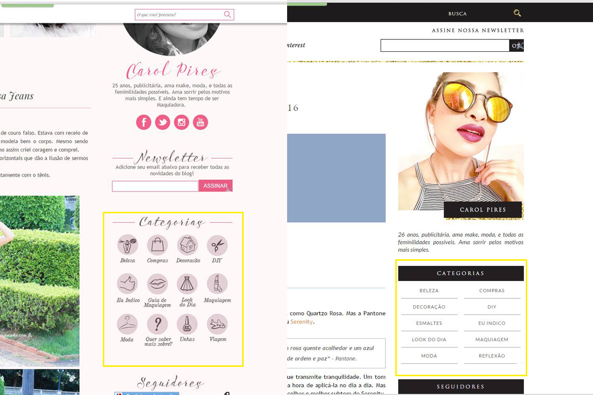 Pode notar que o glitter ficou apenas em alguns detalhes do layout, não queria em muitos lugares para não poluir. O fundo antigo era um tom de rosa bem claro e o novo é branco.