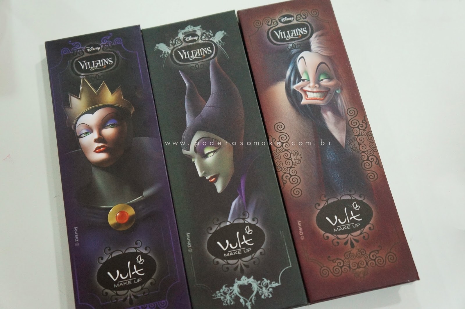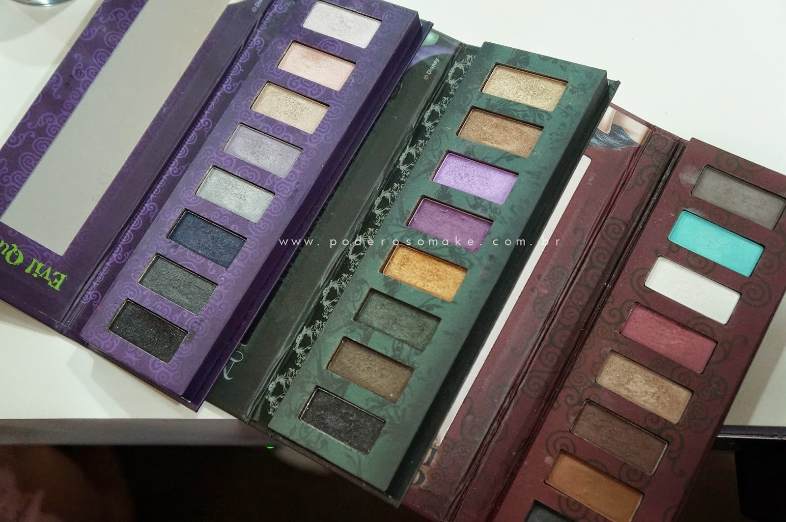 Evil Queen, Malévola e Cruella De Vil. Cada paleta possui 8 cores de sombras, sendo que apenas a da Cruella tem opções opacas.